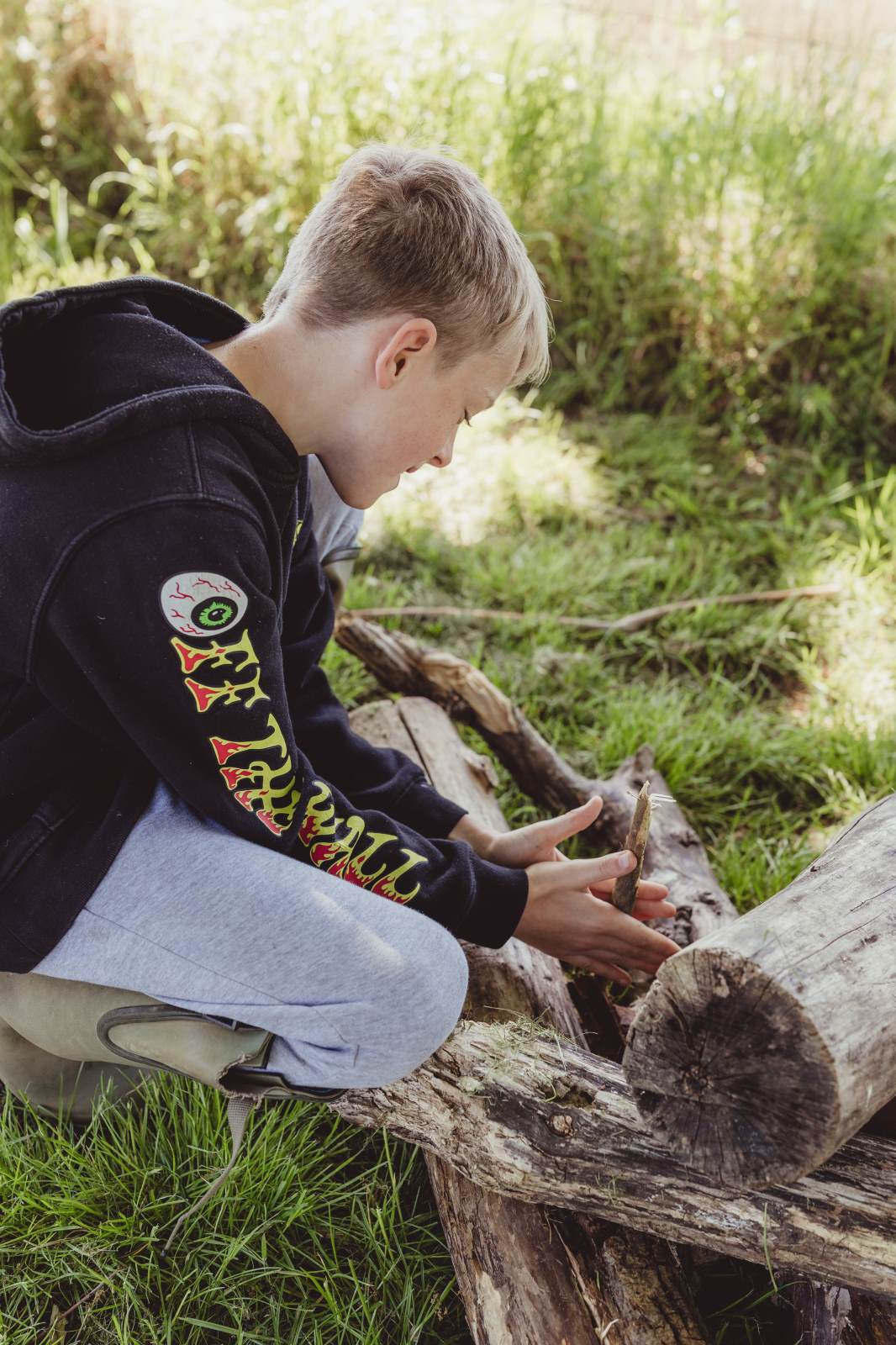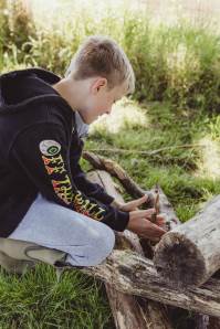 Activities can include: making dens, looking at insects, collecting sticks, tying knots, building and enjoying a campfire, whittling wood or just playing in mud!